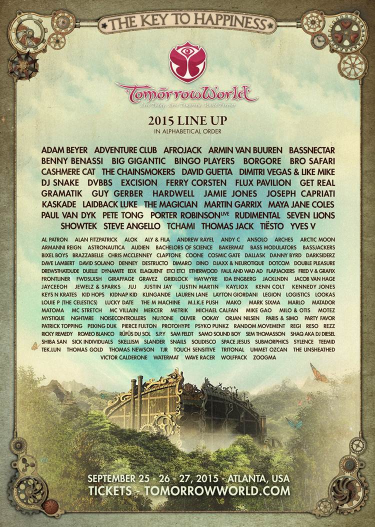 After almost a year of waiting by the plethora of superfans of TomorrowWorld, TomorrowWorld has finally announced it’s large lineup of artists for this year’s festival. TomorrowWorld, for those who don’t know, is a high-profile festival that takes place on the last weekend of September (from the 25th to the 27th), near Atlanta, Georgia. The festival brought in about 160,000 guests last year, and anticipate even greater numbers this year. With this in mind, the DJ Lineup is as great as every, with headliners including Adventure Club, Afrojack, Martin Garrix, Porter Robinson, Tiesto, DJ Snake, and the DJ Mag No.1 DJ of 2014, Hardwell. I myself, being a huge Porter Robinson fan, can’t wait to see how he performs there, as he’s doing an actual live set instead of a DJ set, something he’s well known for with his Worlds tour. The Line Up poster will be posted below, along with a full list for those who can’t view or read the picture. You can learn more about TomorrowLand or buy tickets on their official site.