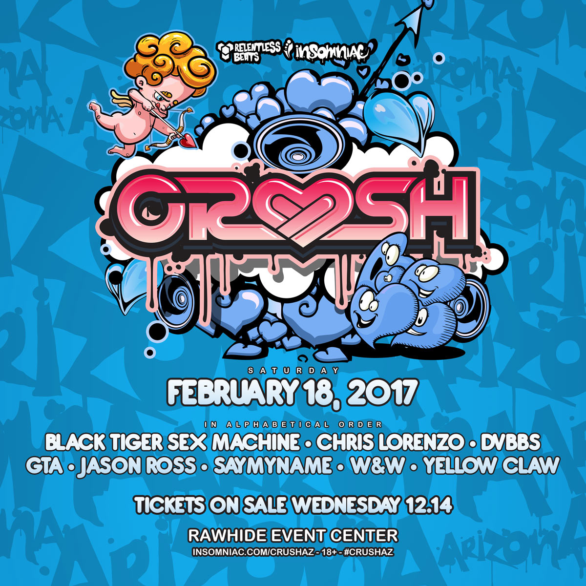 Crush Arizona 2017 – The 8th Annual Crush Arizona returns February 18, 2017, at Rawhide Western Town & Event Center. Presented by Relentless Beats and Insomniac Events, Arizona’s longest standing EDM festival will feature producers Black Tiger Sex Machine, Chris Lorenzo, DVBBS, GTA, Jason Ross, SayMyName, W&W, Yellow Claw and more.