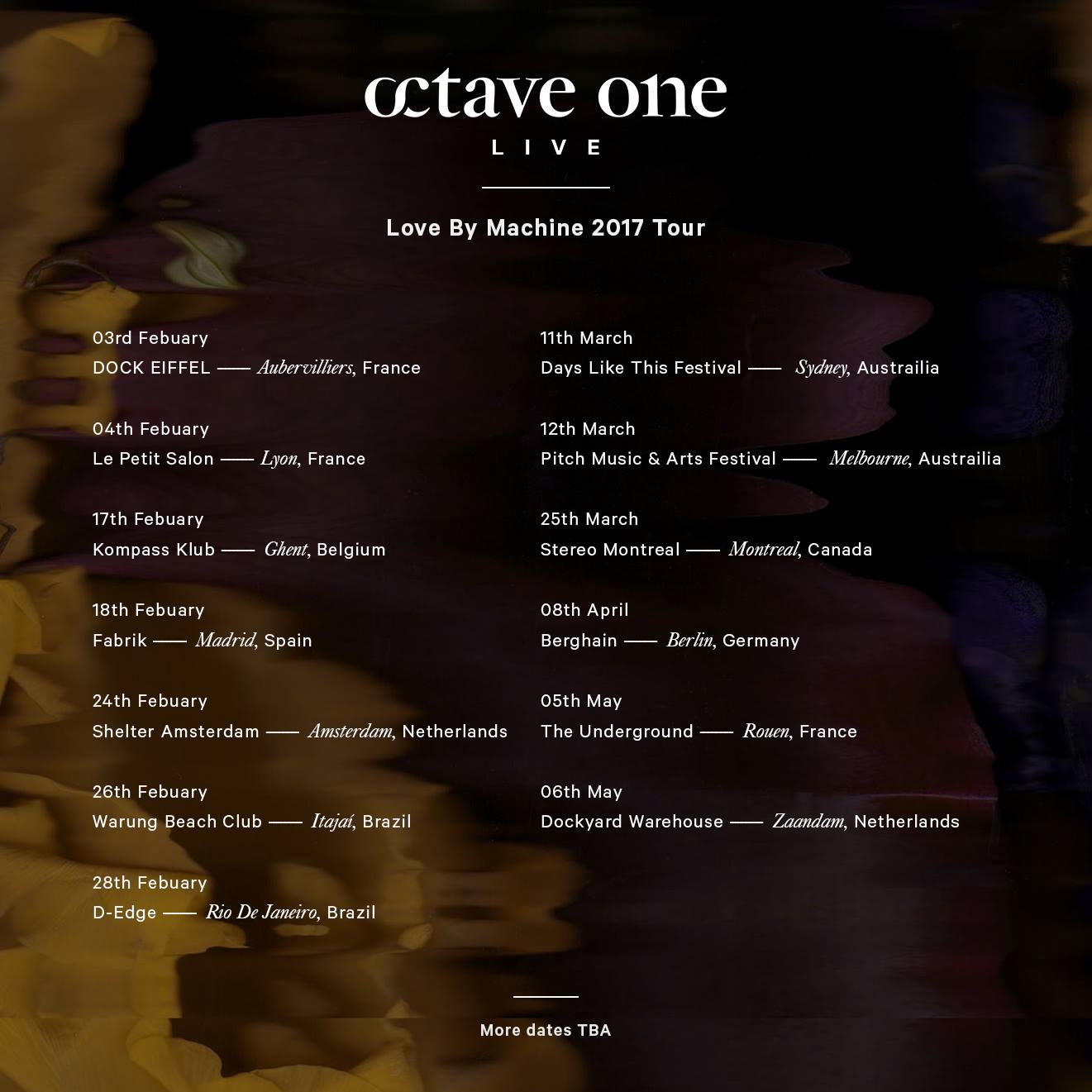Octave One – Love By Machine Tour – Detroit techno duo Octave One have announced the first phase of tour dates to mark the release of their recent album Love by Machine. Quickly selling out as a double vinyl package, the Burden brothers are now gearing up to bring the experience live with reworkings of the album tracks as well as incorporating much new unreleased material into the form of Love by Machine live. More dates to be announced.