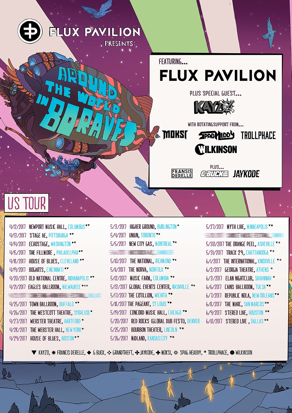 Flux Pavilion is no stranger to touring the United States on a bus, but on this tour he’s on a one-man mission to change the game. With next level production and a number of surprises in store, Around the World in 80 Raves promises to be an unforgettable moment in the history of modern bass.