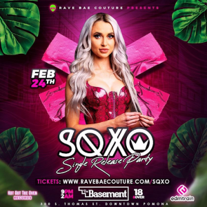 In celebration of her first single release, Los Angeles-based fashion brand Rave Bae Couture has partnered up with SQXO to produce a single release party into the night of the song’s release at Bassment Nightclub in Pomona: February 24th. Tickets can be found at Ravebaecouture.com/SQXO and are $20 in advance, $25 at the door or free before 10pm for attendees over 21. Supporting acts include Inland Empire Native Novacane, fellow HOTOR artist Little Fohx, with a few special guests.. Guests must be 18+ with valid ID and 21+ to drink. Tables and Bottle Service are available via texting “RAVE BAE” to 909.455.8885. For attendees who cannot make the event, a LiveStream Option will be available for free powered by EDM Train.