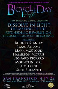 The celebration will be an all day event with day and evening programming. For the first time, Bicycle Day SF is offering day programming with a film screening of filmmaker Seth Ferranti’s latest documentary, “Psychedelic Revolution: The Secret History of the LSD Trade” followed by an interactive panel of leading experts in the fields of activism, research, the arts, and decriminalization. The speaker panel will include many familiar names in the world of psychedelics including medicinal chemist and creator and director of Vice’s Hamilton’s Pharmacopeia Hamilton Morris, Leonard Pickard, Isaac Abrams, Rhoney Stanley, Timothy Tyler, Seth Ferranti, Mark McCloud, Mountain Girl, Ryan Jay Beauregard, and Madison Margolin.